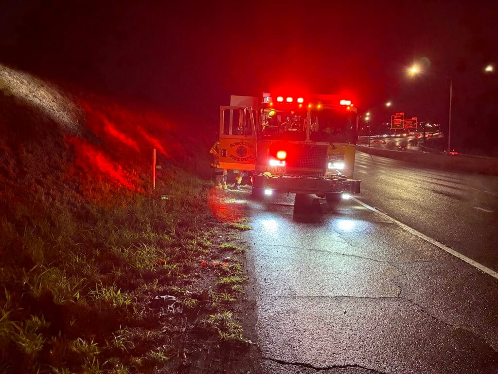 CAPTION: Firefighters arriving quickly at the scene. The small dent on my Tesla.